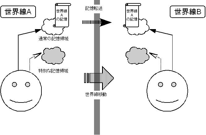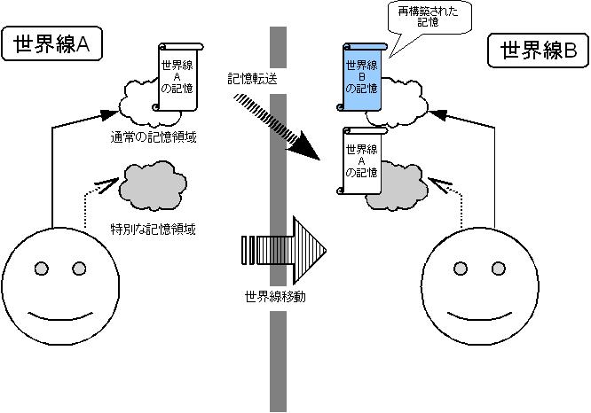 Dメールの過去改変では、オカリンを除く者(例えば、全人類)の記憶は、転送先世界線の各自の脳の特別な記憶領域に転送されていると仮定すれば、再構築分の記憶を有したまま、転送前の記憶を保持することが可能となるわけです(図1参照)。